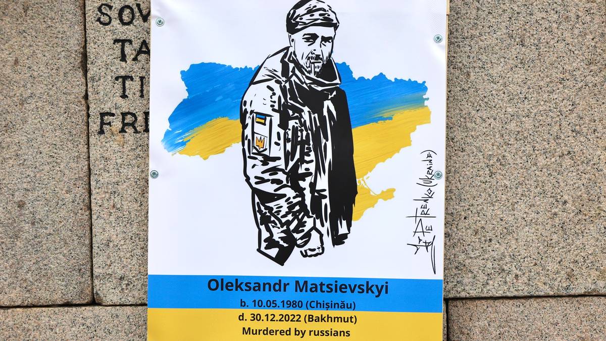 Denne gangen hang det en tegning på monumentet med et portrett av den ukrainske soldaten, som før han ble henrettet ble tvunget til å grave sin egen grav.