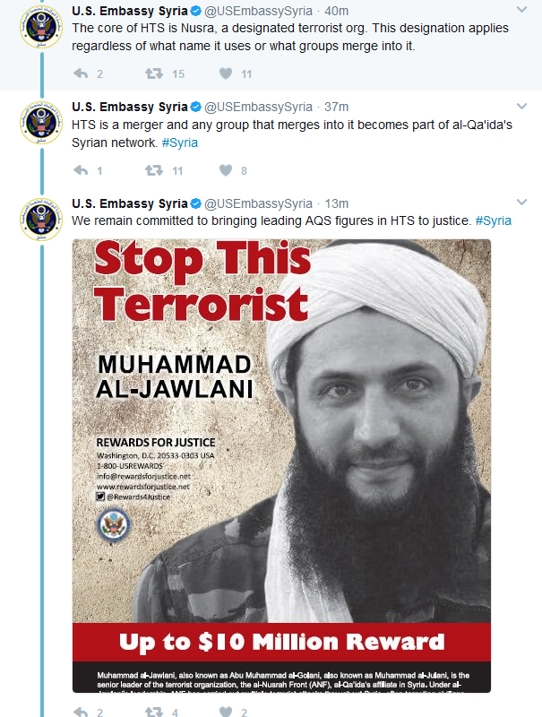 USA har fjernet Hay'at Tahrir al-Sham (tidl. Nusra/AQ i Syria) fra terrorlisten, men la nylig ut en 10 mill USD dusør på den militære lederen (og de fakto leder) Abu Mohammed al-Jolani. Grunnen til at dem ikke vil liste dem som terrororganisasjon antas å være pga HTS absorberte Harakat Nour al-Din al-Zenki i forrige "merger", som var støttet av USA med TOWs, var med i "Train and Equip"-programmet osv.