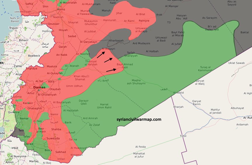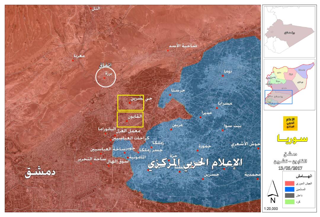 Opprørerne i det som var Qaboun-lommen, som var en liten lomme i nærheten av den større opprørerlommen i øst-Ghouta i Damaskus, har takket ja til å bli evakuert til Idlib. Ellers i den større lommen har det vært mye kjemping mellom opprørerne seg i mellom de siste par ukene, mellom Jaysh al-Islam som tradisjonelt har dominert området, og Faylaq al-Rahman som har alliert seg med Hay'at Tahrir al-Sham (tidl. Nusra osv).