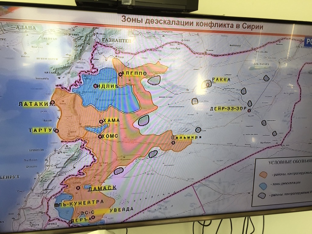 Safe zones i blått, avtalt mellom Tyrkia, Russland (Syria) og Iran. Mesteparten av Tigerstyrkene ++ som har vært i Hama og knust opprøreroffensiven nylig ryktes å flyttes mot Palmyra for å så angripe mot Deir Ez-Zor.