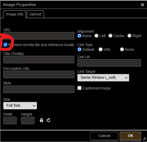 Når man skal legge inn bilder så må de ikke lastes opp​. Vis du fjerner at filen skal hentes og lagres lokalt så skal det gå helt fint. Har du prøvd dette?
