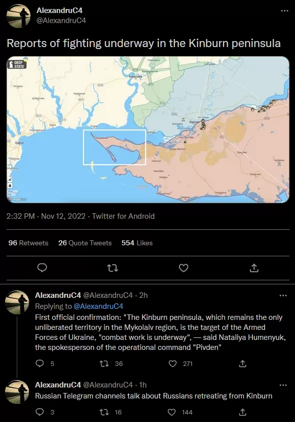 Mildt sagt en del forvirrede meldinger som flyr fra alle sider nå. Best å vente til i morgen for å se hva ståa er. Kan virke som alt snakket om å ta det forsiktig mot Kherson ikke helt stemte men mer enn det vites ikke....