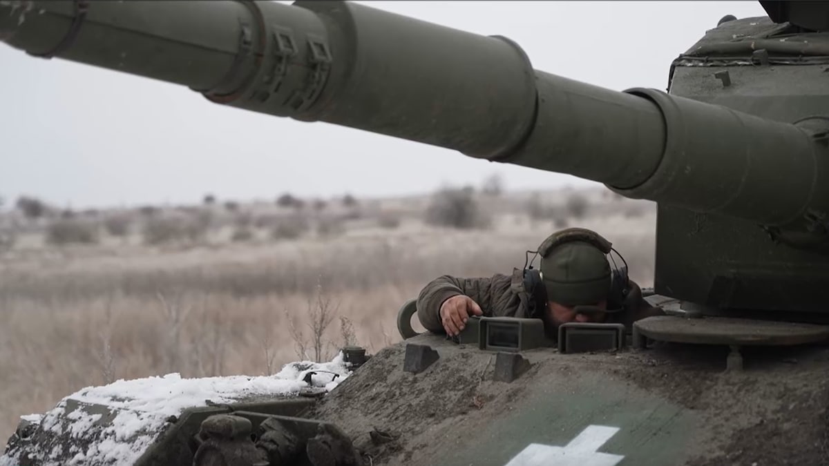 Leopard 1A5 DK på ukrainsk jord. Det oppgis at vognene har får ekstra pansring i Ukraina, men samtidig oppgir de ukrainske intervjuobjektene at det ikke er moderne vogner, men at de likevel kan vil gjøre nytte for seg som infanteristøtte.
