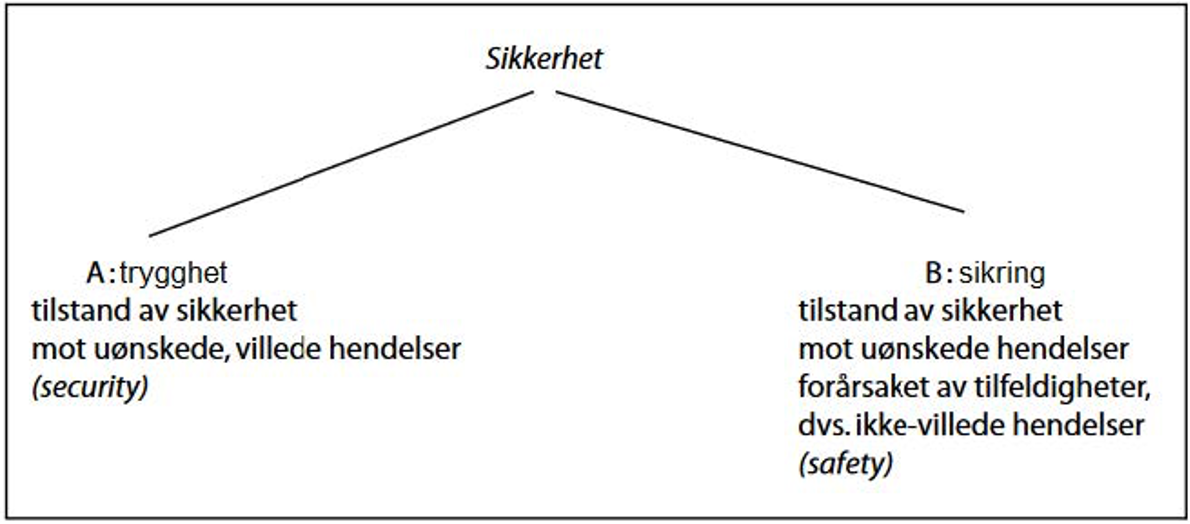 Figur 1: Illustrasjon av Vinjes forslag til begrepsavstemmelse. Illustrasjonen er en sammenslåing av figur 5.1 og 5.2 i NOU 2006: 6, s. 229.Vinje foreslo at trygghet kunne erstatte security, og i mangelen på et bedre ord ble sikring foreslått som et erstatningsord for safety. Vinje erkjente at denne tilnærmingen var en ren skrivebordskonstruksjon, ikke hadde opphav i litteraturen om emnet og heller ikke opplagt ville inngå i dagligtalen. Petroleumssektorens anvendelse av begrepet sikring var også motsatt av den som ble foreslått av Vinje, ettersom sikkerhet der lenge hadde vært ensbetydende med safety. Utvalget var på linje med Vinje, og understreket betydningen av at sikkerhet burde videreføres som et hypernym, ettersom sikkerhetsarbeid burde adressere både safety og security. Når det gjaldt avløserordene trygghet og sikring, valgte utvalget heller å beskrive ulikhetene der det var behov for det – og skjøv problemet foran seg.