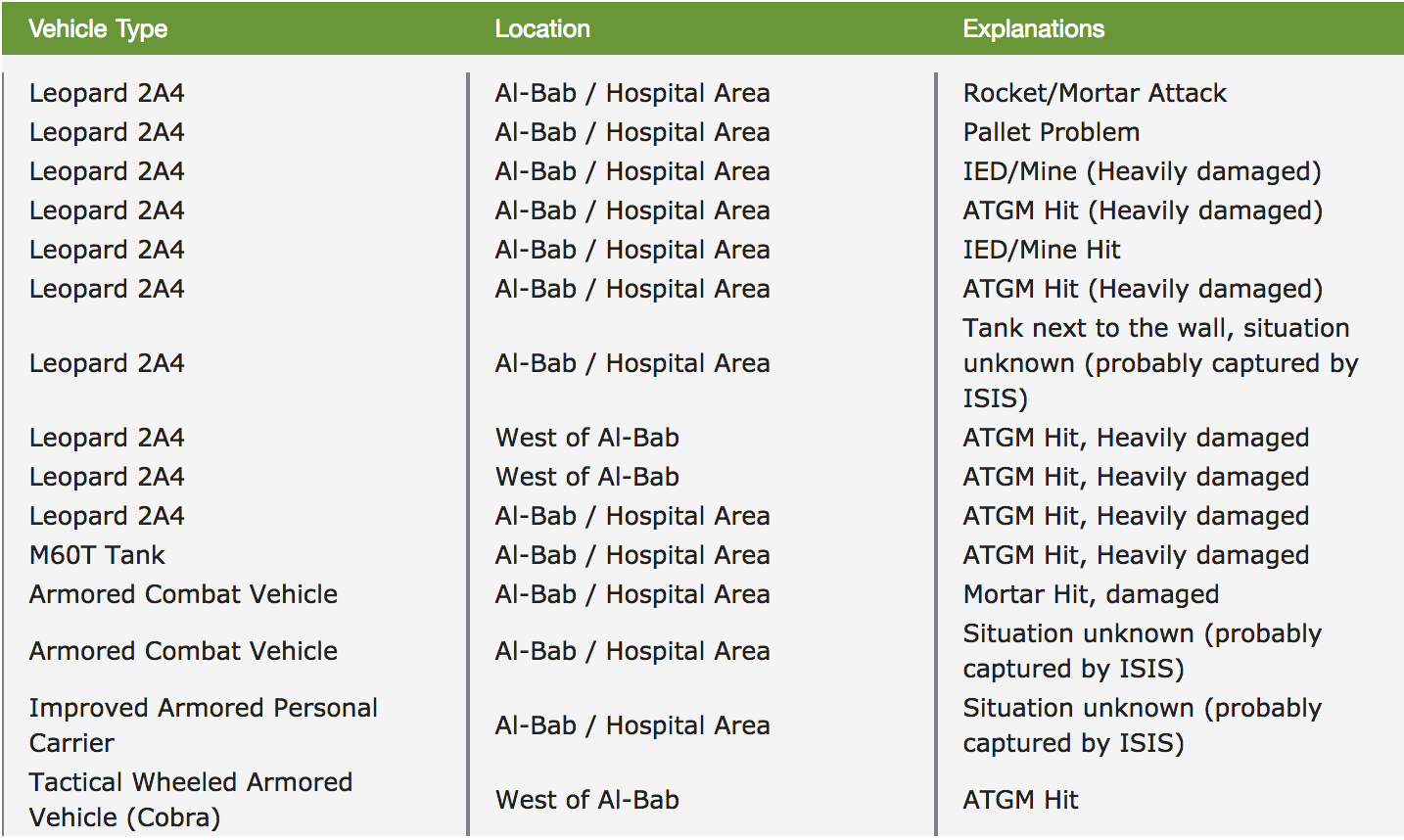 ISIS skal ha fått treff på Leo med TOW-2 og Kornet, minst tre vogner. Så langt ikke noen drepte eller alvorlig såret i besetning.