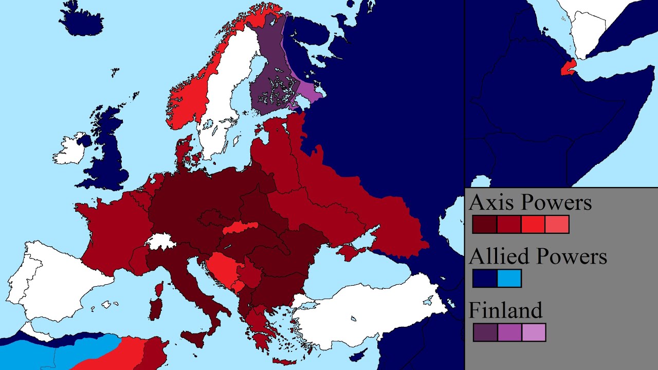 Burgundy: Areas militarily occupied by the Axis Powers.