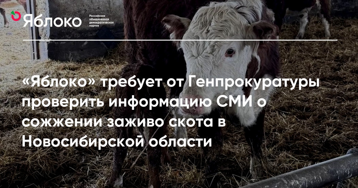 Председатель партии «Яблоко» Николай Рыбаков направил обращение генпрокурору Александру Гуцану с требованием проверить информацию от журналистов издания «Такие дела» о том, что десятки тысяч коров и другого скота в Новосибирской области в ходе утилизации из-за «секретной опасной болезни» были сожжены заживо. Препараты, которые использовали ветеринары, по данным нескольких источников, только парализуют мышцы животных без потери сознания.