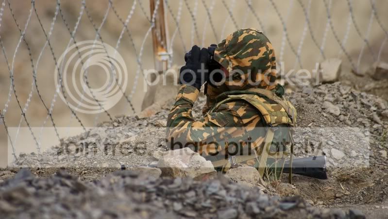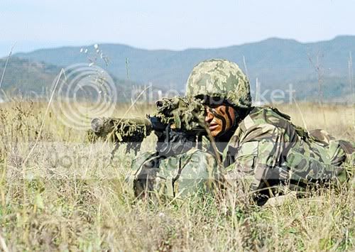 Merket på armen til soldat nr. 2 fra høyre, samt både utrustning og uniformer forøvrig sier meg ganske klart at det der er marineinfanteri. Bereten til gubben i front er utvilsomt marineinfanteriets. Men - er det bare jeg som har en sterk følelse av at det hodet (eventuelt hele gubben) er fotoshoppet på i ettertid? Han har beret, ikke hjelm, blikket ser helt feil ut i forhold til de andre og det er noe fishy med lyset?