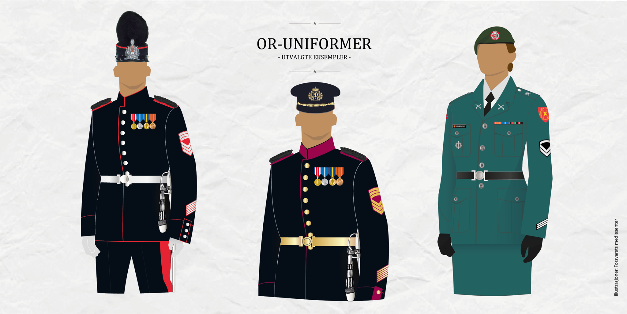 Etter bildene å dømme skal or-2-4 bruke dagens grenaderuniform, og or-5-9 bruke dagens offisersuniform. Bare med distinksjoner og års/tjenestegjøringsstriper på armen....