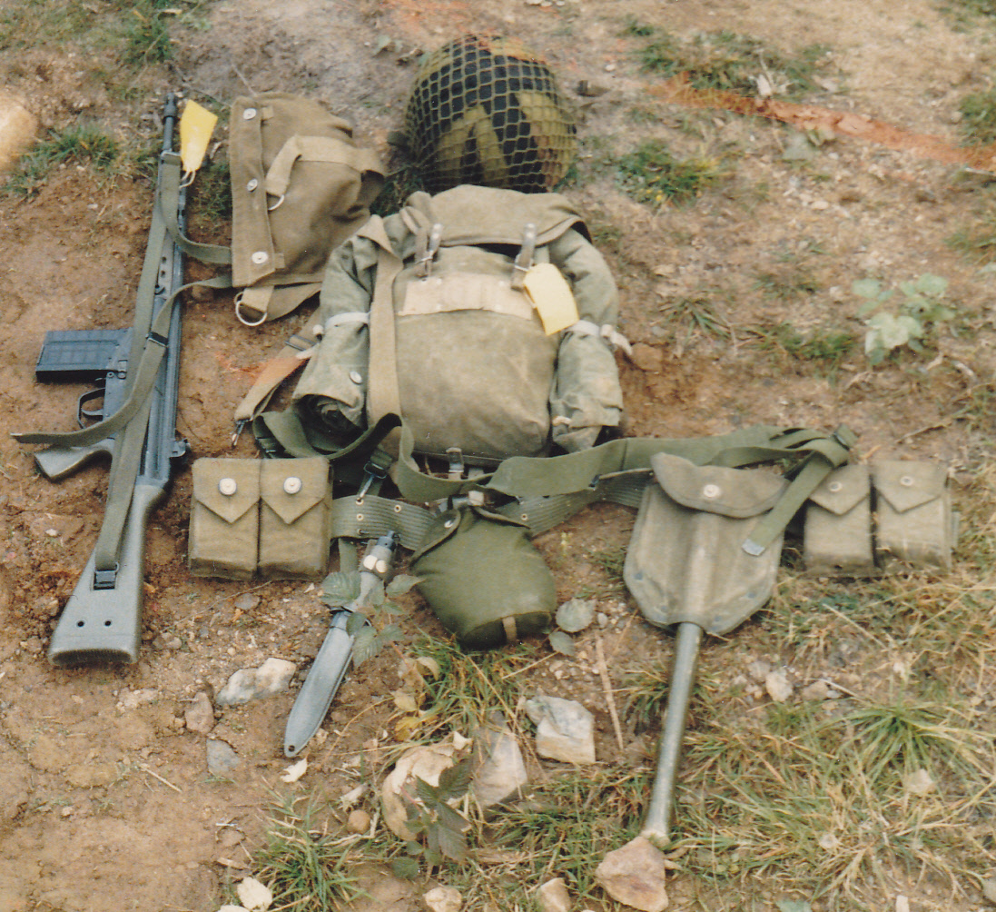 Dette bildet viser stridsutrustningen for en infanterist på 1970- og 1980-tallet: AG3, stridsbelte montert av pistolbelte og kryssremmer med bajonett, feltflaske, feltspade og magasintasker for 80 skudd, vernemaske og stridssekk med teltduk, 2 teltstenger, 3 teltplugger, 5-metersnøre, 1 enkeltmannspakning, vannrensesett enmanns, pussesett for våpen, kokekar, spisebestikk, RSP-boks og 1 par tykke ullsok...