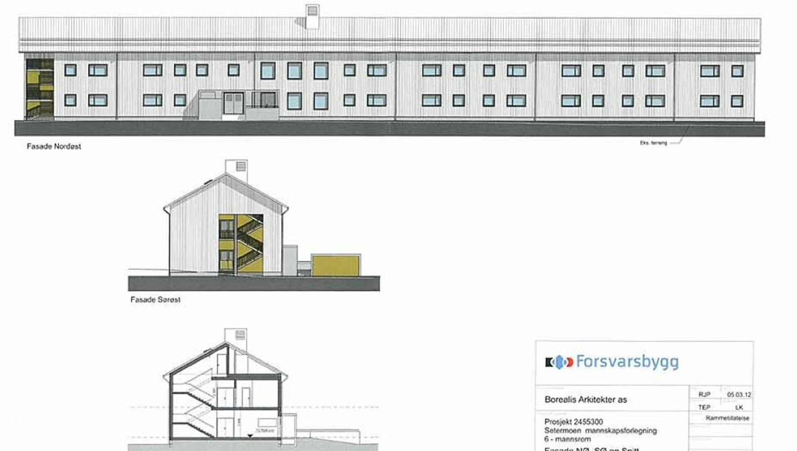 Det er standard løsning for kaserne, utfordringen er at denne løsningen er høyere enn høyden tillatt på den aktuelle tomten (som jeg tror var standard høyde i Plan- og bygningsloven). Det var derfor behov for dispensasjon, dette fikk da Forsvarsbygg, MEN naboer påklaget dispensasjonen. Forsvarsbygg fikk da rammetillatelse til å starte byggingen på egen risiko mens klagebehandlingen pågikk hos Statsforvalteren. Så går da Statsforvalteren hen å tar klagen til følge og tillatelsen faller da bort. K...