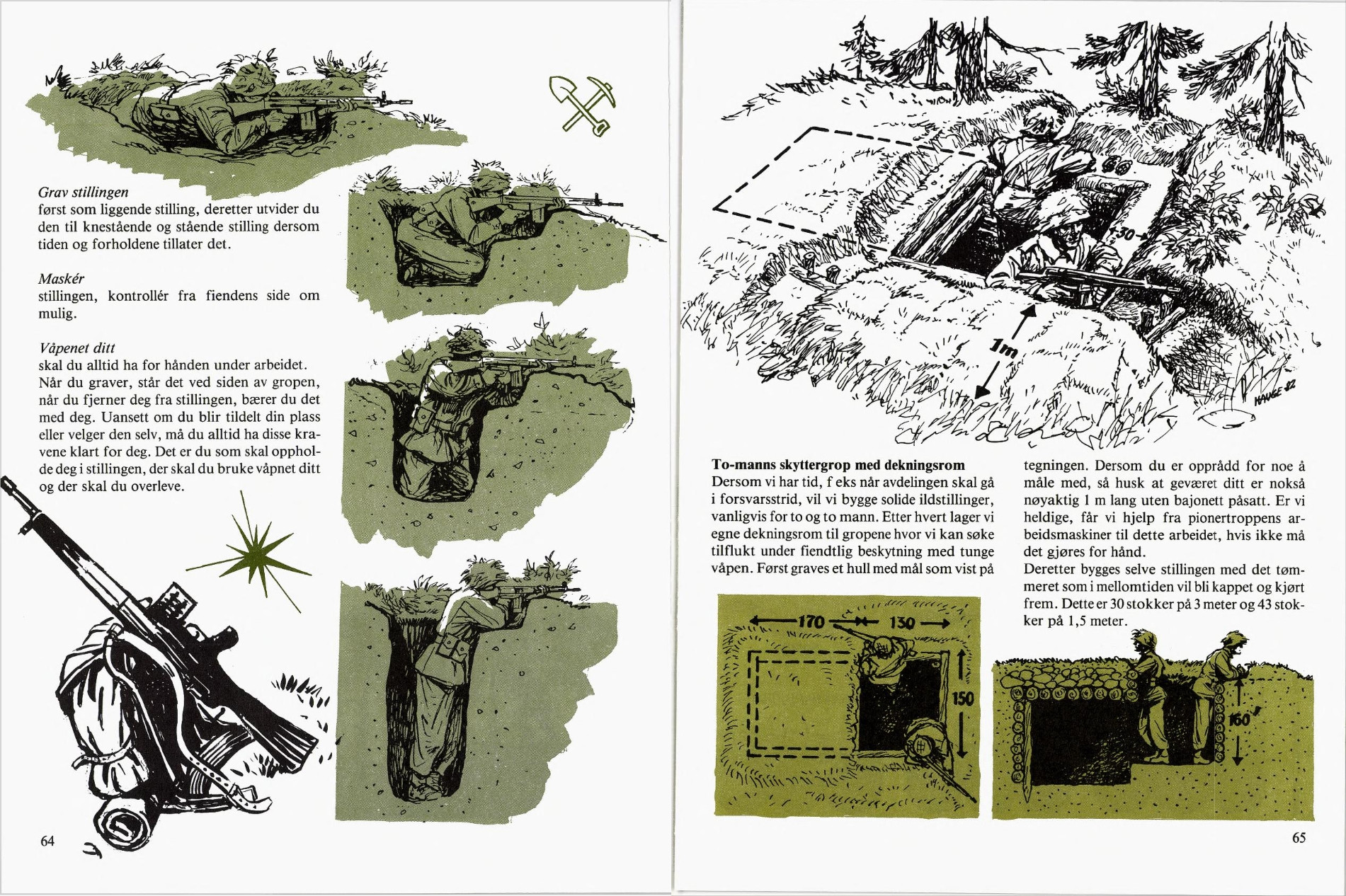 Vi må heller ikke glemme det materialet vi er mest velsignet med i dette landet, nemmelig fjell. Ingenting slår løpegraver og dekningsrom nedsprengt i granitt. Ulempen er at dette materielet har en noe høy brukerterskel. I mobiliseringshæren ble dette løst med at infanteribataljonenes pionertropper var utstyrt med bensindrevne pionär bormaskiner slik at pionertroppene kunne sprenge grøfter og groper i fjell, uavhengig av tilgang på tungt utstyr, tyngre maskiner ol.. Pionär-maskinene var svenskpr...