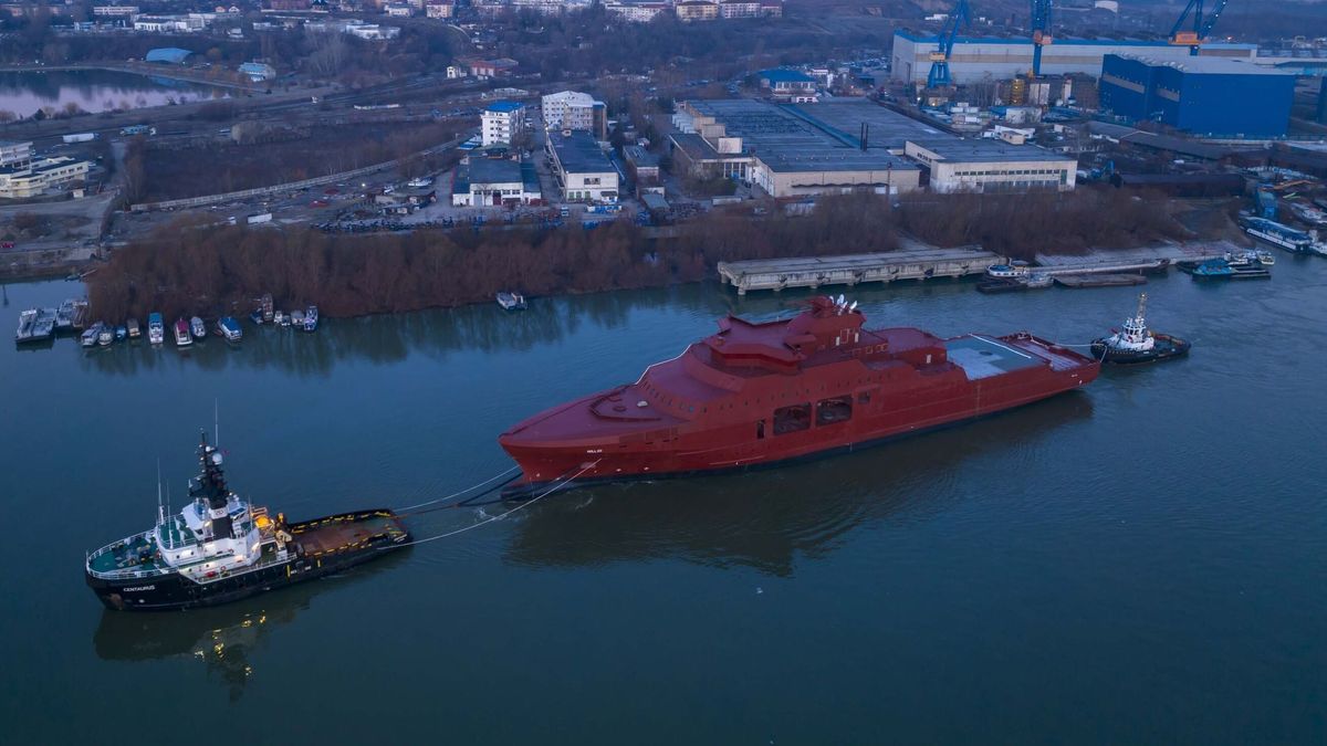 I dag tidlig forlot det første fartøyet i Jan Mayen-klassen skrogverftet i Romania, og er nå under slep til Norge og Vard Langsten hvor det skal videre utrustes.