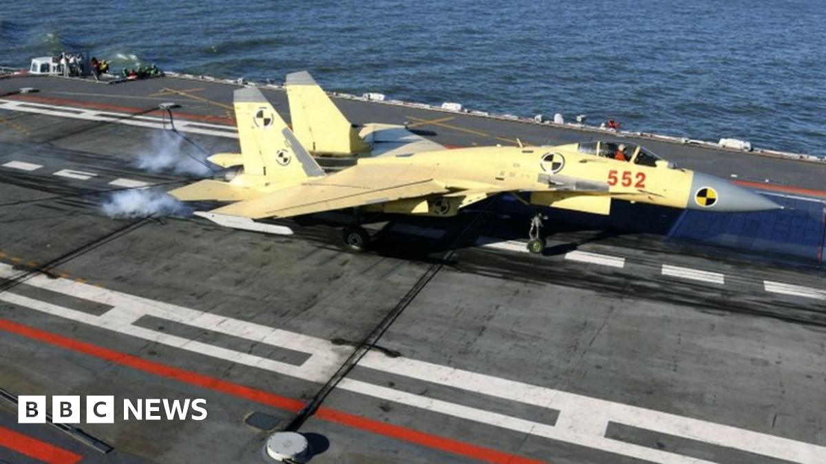 A Chinese-made fighter jet lands on Beijing's first aircraft carrier, the Liaoning, officials say, bolstering China's military capacity in territorial disputes.