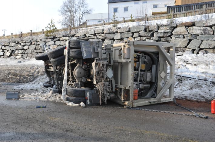 Krokbil med tankflak i grøfta på Bardufoss i dag.