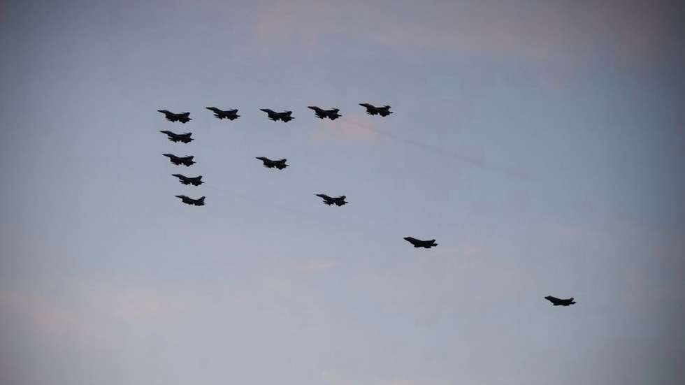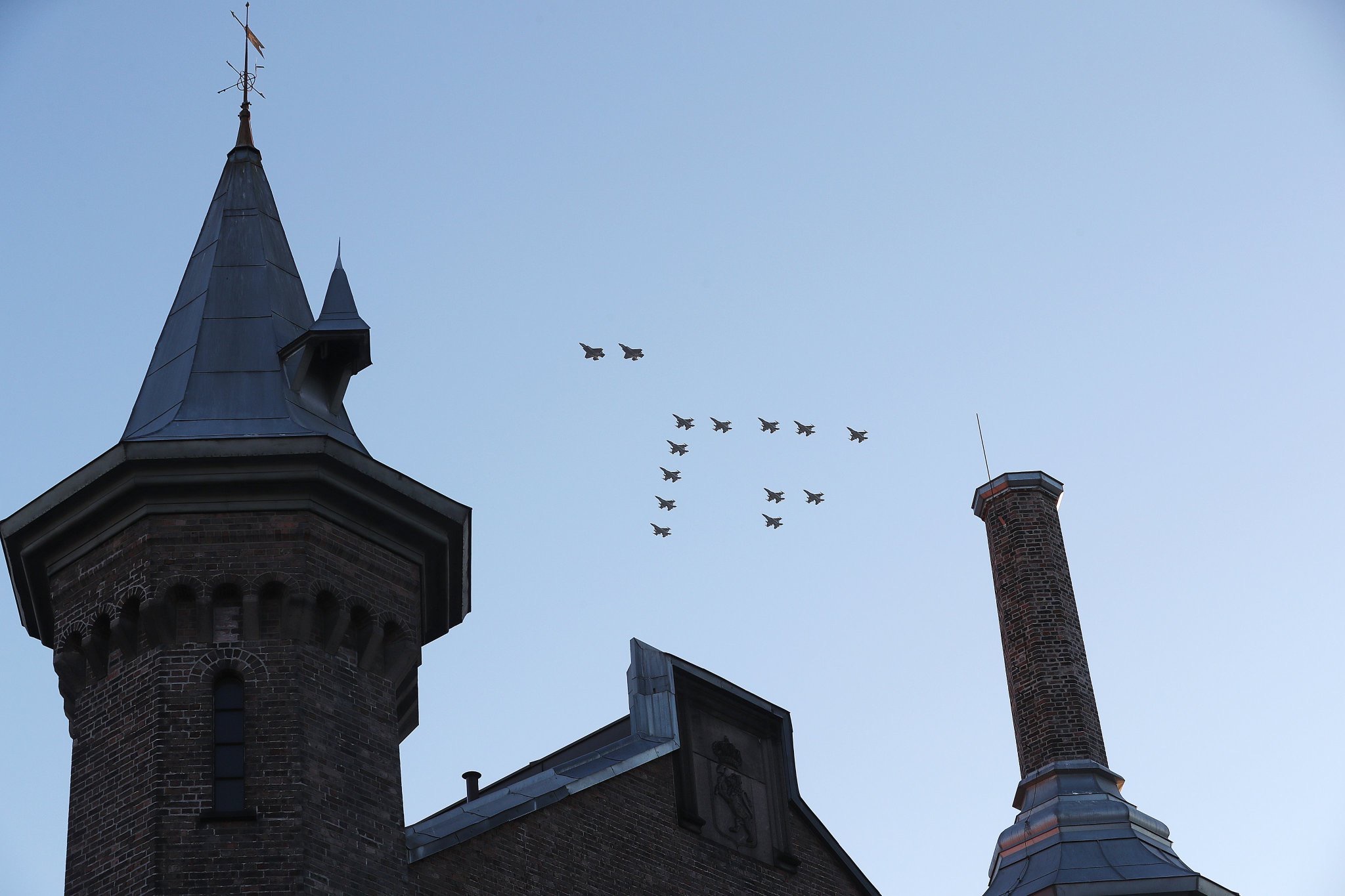 12 F-16 og 2 F-35 i vakker formasjon over landet, her Akershus festning.